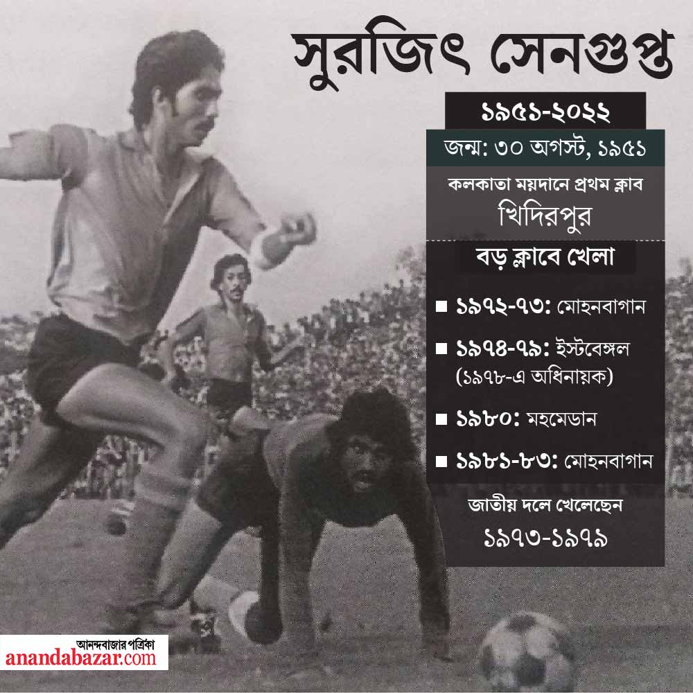 ঘটনাচক্রে, তার ঠিক পর দিন করোনায় আক্রান্ত হয়ে হাসপাতালে ভর্তি হলেন সুরজিৎ সেনগুপ্ত। এবং ‘কত স্মৃতি’-র অন্যতম অংশীদার সুরজিৎও সেই চলে গেলেন স্মৃতির দেশে। সত্তর দশকে বাংলার উত্তাল ফুটবল ময়দান এমনই ছিল। সুভাষ ভৌমিক-শ্যাম থাপা-শান্ত মিত্র-সুরজিৎ সেনগুপ্ত-সৈয়দ নঈমুদ্দিন— একটা একাত্মতা ছিল এঁদের মধ্যে। সেই পরিবার আরও ভেঙে গেল সুরজিতের প্রয়াণে।