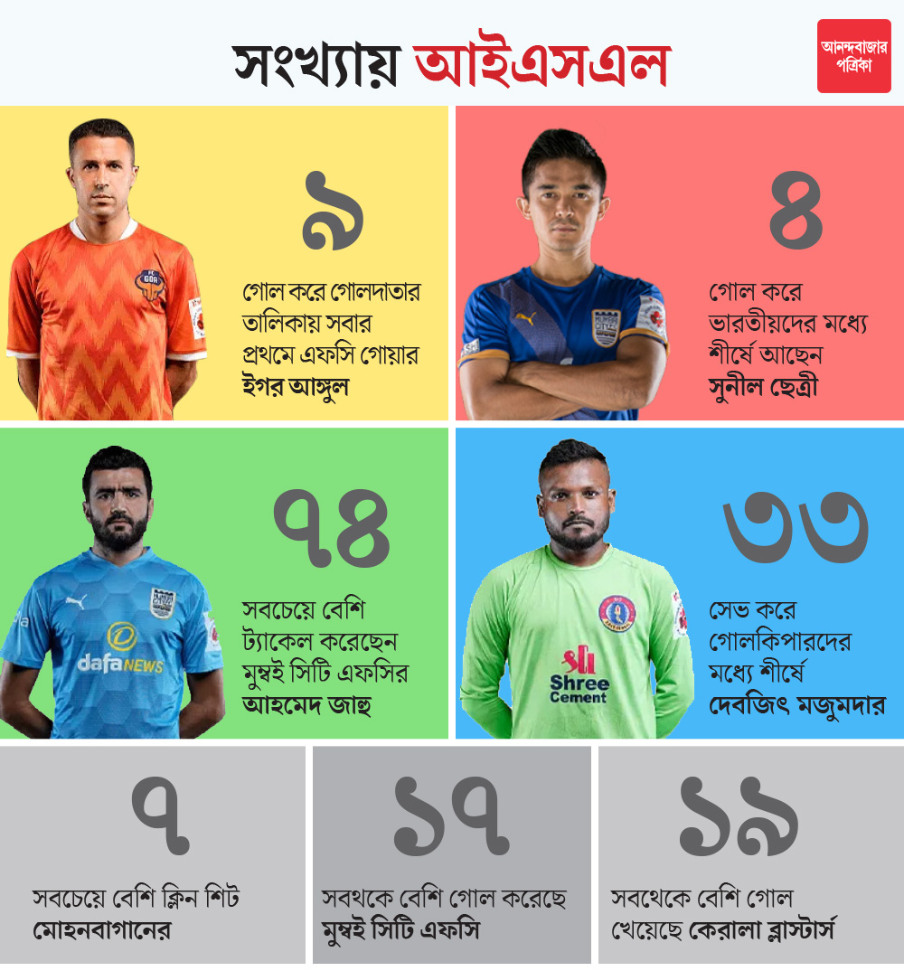 আইএসএলের প্রথম পর্বের পর আক্রমণ ভাগে বিদেশি ফুটবলারদের রমরমা। ডিফেন্সে ভারতীয় ফুটবলাররা প্রভাব ফেললেও সেখানে বিদেশীরাও নিজেদের ছাপ রেখেছেন। ৯টি গোল করে এই তালিকায় সবার প্রথমে আছেন এফসি গোয়ার স্ট্রাইকার ইগর আঙ্গুলো। ৮ গোল করে তালিকায় দ্বিতীয় জামশেদপুরের ভালস্কিস। হায়দরাবাদ এফসির স্যান্তানা, এটিকে মোহনবাগানের রয় কৃষ্ণ মুম্বই সিটি এফসির আরেক স্ট্রাইকার লে ফন্ড্রে তিন জনই ৬টি করে গোল করেছেন। ভারতীয়দের মধ্যে তালিকায় আছেন সুনীল ছেত্রী। চারটি গোল করেছেন তিনি। ডিফেন্ডার হিসেবে সবচেয়ে বেশি ট্যাকেল করেছেন মুম্বই সিটি এফসির আহমেদ জাহু (৭৪টি) তালিকায় আছেন ভারতীয় ফুটবলার লালেংমাউইয়া (৪৭টি ট্যাকেল)।
