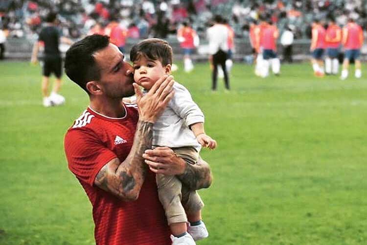 শিশু পুত্রের সঙ্গে ফ্রান গনজালেজ। ফ্রান বলেন, ‘‘আমার লিটল মেরিনার।’’ ছবি: ফ্রানের ফেসবুক পেজ থেকে