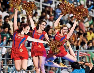 ইডেনে কেকেআর বনাম বেঙ্গালুরু ম্যাচে আরসিবি চিয়ারলিডারদের নাচ। ছবি: উত্পল সরকার
