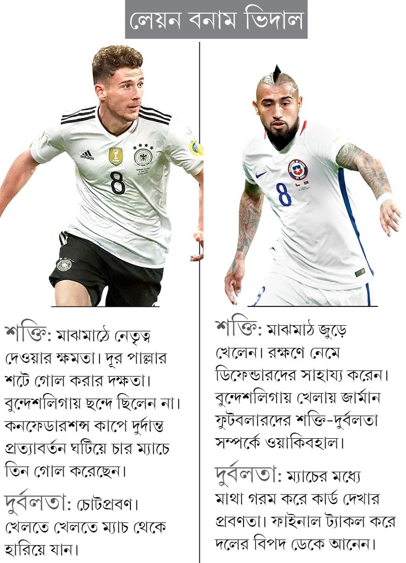 বারো বছর আগে ঘরের মাটিতে কনফেডারেশন্স কাপে সেমিফাইনালে ব্রাজিলের বিরুদ্ধে হেরে গিয়েছিল জার্মানি। তখন প্রধান কোচ ছিলেন য়ুর্গেন ক্লিন্সম্যান। লো ছিলেন তাঁর সহকারী। এ বার ফের জার্মানি আর কনফেডারেশন্স ট্রফির মাঝখানে লাতিন আমেরিকার আর একটা দেশ। শুধু তা-ই নয়। যে দলের প্রধান দুই ভরসা আর্তুরো ভিদাল ও চার্লস আরাগুইজ খেলেন বুন্দেশলিগায়। ম্যাঞ্চেস্টার সিটি-তে খেলেন টাইব্রেকারে পর্তুগাল বধের নায়ক ক্লদিও ব্র্যাভো। চিলে গোলরক্ষক বলেছেন, ‘‘আমাদের দেশে প্রচুর সমস্যা। চ্যাম্পিয়ন হয়ে তাই দেশবাসীকে আনন্দ দেওয়াই আমাদের একমাত্র লক্ষ্য এই মুহূর্তে।’’ সঙ্গে যোগ করেছেন, ‘‘আমি চার সন্তানের বাবা। যদি রাশিয়া থেকে খালি হাতে দেশে ফিরি, তা হলে কনিষ্ঠ সন্তান আমার ওপর প্রচণ্ড রেগে যাবে। তাই গত দু’বছর ধরে আমরা যে ধারাবাহিকতা দেখিয়ে আসছি, আশা করছি এ বারও তার ব্যতিক্রম হবে না।’’ আর ভিদাল তো রীতিমতো হুঙ্কার দিয়ে রাখলেন। বায়ার্ন মিউনিখ তারকা বলেছেন, ‘‘আমরা যে যোগ্য, তা ইতিমধ্যেই প্রমাণ করেছি। পরপর দু’বার হারিয়েছি আর্জেন্তিনাকে। কয়েক দিন আগেই হারিয়েছি ইউরো চ্যাম্পিয়ন পর্তুগালকে। এ বার জার্মানির বিরুদ্ধে জিতলে আমরাই হব বেসরকারি ভাবে বিশ্বসেরা। কারণ, জার্মানি গত বিশ্বকাপে চ্যাম্পিয়ন। কোনও ভাবেই এই সুযোগটা হাতছাড়া করতে চাই না।’’