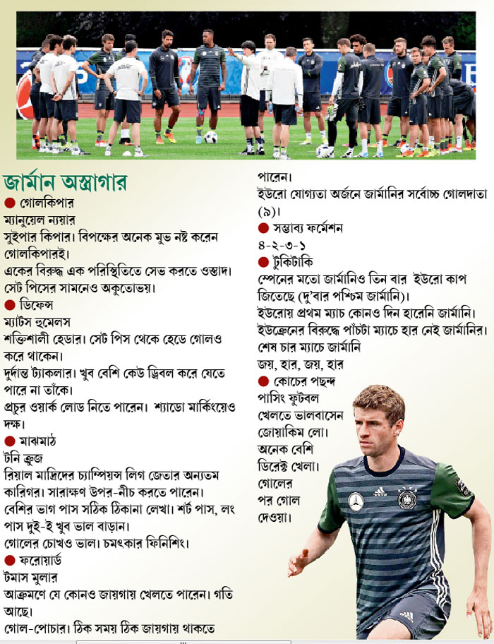 ‘টুর্নিয়েরমানশাফট’ বা টুর্নামেন্ট-টিম হিসেবে বিখ্যাত জার্মানি তা করে দেখাতে পারে কি না, ১১ জুলাইয়ের আগে নিশ্চিত করে বলা সম্ভব নয়। আপাতত যেটা বলা যেতেই পারে সেটা হল, প্রাক্ ইউরো ২০১৬ যে জার্মানিকে দেখেছে, তাদের মোটেই বিশ্বচ্যাম্পিয়নদের মতো দেখাচ্ছে না। বিশেষজ্ঞরা বলা শুরু করে দিয়েছেন, এই জার্মানি তো চূড়ান্ত অ-জার্মান!