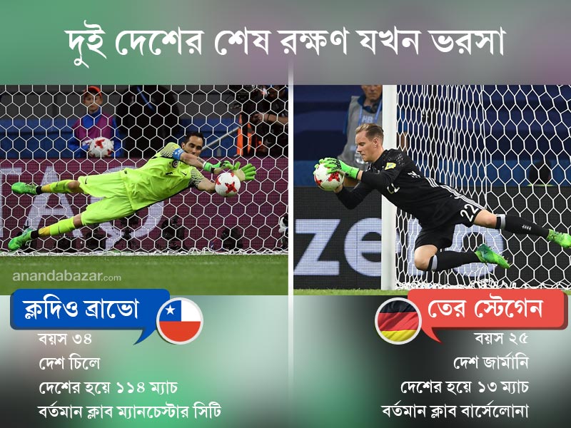 চিলের সঙ্গে রয়েছে ২০১৫, ২০১৬ পর পর দু’বার কোপা আমেরিকা চ্যাম্পিয়ন হওয়ার গর্ব। দু’বারই পেনাল্টি শুট আউটেই বাজিমাত করেছিল চিলে। এ বারও কনফেড কাপে সেই টাইব্রেকারেই পর্তুগালকে উড়িয়ে ফাইনালে পৌঁছেছে চিলে। আর গোলের নিচে যখন ব্রাভো তখন চিলে চাইবে ম্যাচটাকে টাইব্রেকারেই নিয়ে যেতে। আর এই আশঙ্কাতেই ভুগছে জার্মানি দল। এমন কী ক্লদিও ব্রাভোর প্রশংসাও শোনা গিয়েছে লো-র গলায়। তিনি বলেন, ‘‘ক্লদিও ব্রাভো হল আসল পেনাল্টি কিলার। আমাদেরও পেনাল্টি কিক নেওয়ার জন্য ফুটবলার রয়েছে। আমরা ওই পর্যন্ত যাতে ম্যাচ না যায় সেই চেষ্টাই করব কিন্তু যদি হয় তা হলে ভয় পাওয়ার কিছু নেই।’’ ব্রাভো যেখানে পর্তুগালের তিনটি পেনাল্টি শট বাঁচিয়ে হিরো হয়েছেন তখন অন্য সেমিফাইনালে স্টেগেনের হাতে আটকে গিয়েছে মেক্সিকোর একাধিক নিশ্চিত গোলমুখি শট। জার্মানির জয়ে বড় ভূমিকা রেখে গিয়েছেন তিনিও।