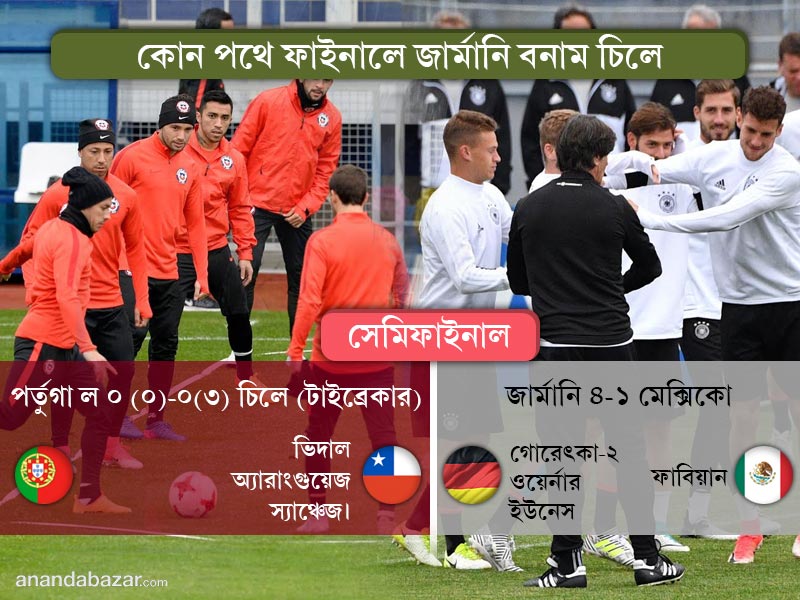 কনফেডারেশন্স কাপের ফাইনালে চিলে-জার্মানি হওয়ার পর থেকেই শুরু হয়ে গিয়েছে কোপা আমেরিকা চ্যাম্পিয়ন বনাম বিশ্বকাপ চ্যাম্পিয়নদের লড়াই। সেদিক থেকে দেখতে গেলে বিশ্ব চ্যাম্পিয়নরা বেশি সমীহই পাবে। কিন্তু শেষ বিশ্বকাপ থেকে কনফেড কাপের ফাইনাল, প্রায় পুরোটাই বদলে গিয়েছে জার্মানি দল। একঝাঁক নতুন মুখ নিয়ে এই ফাইনালে পৌঁছেছে। সেমিফাইনালে মেক্সিকোকে দাঁড়াতেই দেয়নি লো-র অনভিজ্ঞ দল। যে দলের এক নম্বর স্ট্রাইকার মাত্র চারটি ম্যাচ খেলেছে জাতীয় দলের হয়ে। যে দেশের গোল কিপারকে দেশের হয়ে খেলেছেন মাত্র ১৩টি ম্যাচ। সেখানে ক্লদিও ব্রাভোর অভিজ্ঞতাই চিলের মূল অস্ত্র। সঙ্গে ভিদাল, স্যাঞ্চেজদের মতো অভিজ্ঞ ও বড় নাম আত্মবিশ্বাস বাড়াচ্ছে চিলে শিবিরে। জার্মান শিবিরকে ভরসা রাখতে হচ্ছে তিমো ওয়ের্নার, জশুয়া কিমিচ, গোরেৎকাদের উপর। সকলের বয়স ২১-২২। অভিজ্ঞতা অনেকটাই কম।