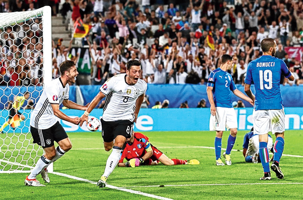 ইউরো বা বিশ্বকাপে যা কখনও হয়নি, সেটা শনিবার করে দেখালেন ওজিলরা। কোনও বড় টুর্নামেন্টে প্রথম বার ইতালিকে হারিয়ে ইতিহাস গড়ল জার্মানরা। কিন্তু জার্মানির সব আশায় জল পড়ে যেতে পারত যখন ওজিলেরা ১-০ করার পর বোয়েতাং-এর ভুলে নির্ধারিত সময়ে ১-১ করে ফেলে ইতালি। কিন্তু আজ বোধহয় অঘটনটা ঘটারই ছিল, কেন না বোনুচ্চির গোলে ১-১ করলেও জার্মানির ইতিহাস গড়া শেষ পর্যন্ত আটকাতে পারে নি ইতালি। ম্যাচ গড়ায় সাডেন ডেথ অবধি। পেনাল্টিতে শেষ পর্যন্ত ৬-৫ গোলে ইতিহাস ছুঁয়ে ফেলে জোয়াকিম লো-র ছেলেরা।