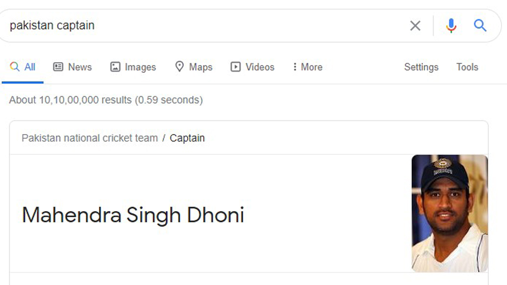 পাকিস্তানের অধিনায়কের নাম জানেন? গুগল করে দেখলে কিন্তু চমকে যাবেন। কারণ পাকিস্তানের অধিনায়কের নাম গুগল বলছে মহেন্দ্র সিংহ ধোনি!
