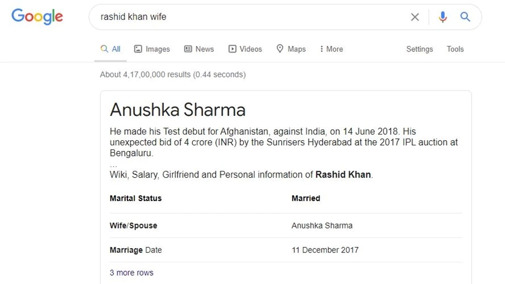 ভারতের ক্রিকেট অধিনায়কের স্ত্রী হয়ে গেলেন আফগান স্পিনারের স্ত্রী! সৌজন্যে বিশ্বের বৃহত্তম সার্চ ইঞ্জিন গুগল। মজা নয়, সম্প্রতি এই ঘটনা নিয়েই উত্তাল নেটদুনিয়া। গুগল সার্চে আফগান ক্রিকেটার রশিদ খানের স্ত্রী লিখলে দেখাচ্ছে অনুষ্কা শর্মার নাম।কিন্তু বিরাটের স্ত্রীকে কেন রশিদের স্ত্রী বলছে গুগল?