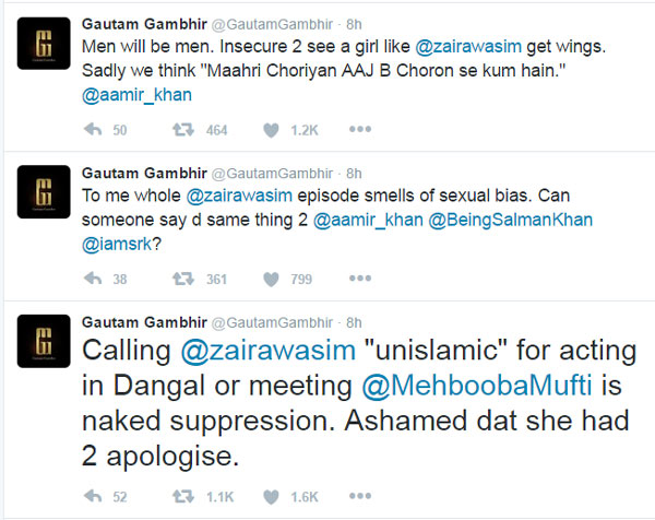 গৌতম গম্ভীর সরাসরি তাঁর আক্রমণকারীদের একহাত নিয়েছেন। জাইরার ক্ষমা চাওয়ারও প্রতিবাদ করেছেন তিনি। জাইরা মেয়ে বলেই এটা হয়েছে বলে দাবি গম্ভীরের। তাঁর প্রশ্ন, আমির খানকে কেউ বলতে পারত এ ভাবে? স্ক্রিনের গীতা ফোগতের পাশে দাঁড়িয়েছেন বাস্তবের গীতাও। জাইরাকে নিজের সিদ্ধান্তে স্থির থাকারও পরামর্শ দিয়েছেন তিনি। জাইরার সমর্থনে আমির খানের টুইটকে রি-টুইট করেছেন গৌতম গম্ভীর।
