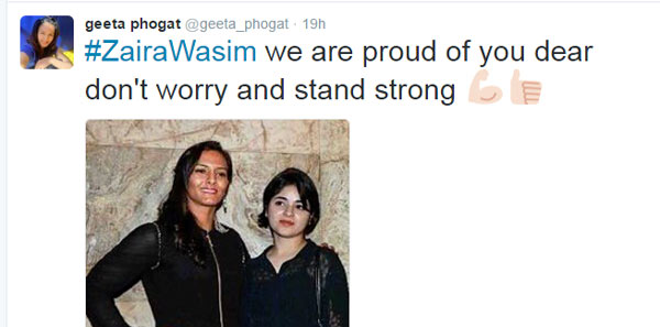 জাইরা ওয়াসিমের টুইট পাল্টা টুইট ঘিরে সরগরম গোটা দেশ। আমির খানের পর তাঁর সপক্ষে এ বার মুখ খুললেন ক্রিকেটার গৌতম গম্ভীর ও গীতা ফোগত স্বয়ং। দু’জনেই টুইট করে তাঁদের মতামত জানালেন। জম্মু-কাশ্মীরের মুখ্যমন্ত্রী মেহবুবা মুফতির সঙ্গে দেখা করেছিলেন কাশ্মীরের এই অভিনেত্রী। যিনি দঙ্গলে অভিনয় করেছিলেন গীতা ফোগতের ছোটবেলার ভূমিকায়। সেই দেখা করা নিয়েই তোলপাড় হয়ে যায় সোশ্যাল মিডিয়া। তার পর ক্ষমা চেয়ে ফেসবুকে লেখেন জাইরা। পরে সমালোচনার মুখে পড়ে সেই পোস্ট তুলে নেন তিনি। জাইরা ফেসবুকে লিখেছিলেন, ‘‘আমার আশা সকলেই মনে রাখবেন আমার বয়স মাত্র ১৬। আমি যা করেছি তার জন্য দুঃখিত। কিন্তু এটা বুঝে করিনি। আশা করছি আমাকে ক্ষমা করবে সবাই।’’ এর পর বিভিন্ন ফিল্ডের সেলিব্রিটিরা চাঁর সপক্ষে টুইট করতে শুরু করেন।