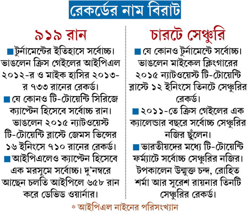 এর পর টিম চার্জড হবে না কেন? টানা চার ম্যাচ জিতে প্লে অফ যাবে না কেন? শোনা গেল, গ্রুপ পর্যায়ে ‘হারলেই মৃত্যু’ পর্ব শুরুর আগে টিমকে নাকি একটা কথা বলেছিলেন কোহালি। বলেছিলেন যে, দু’ভাবে ব্যাপারটাকে দেখা যেতে পারে। সামনের চার-পাঁচটা ম্যাচে জয়ের অসম্ভব চাপ নেওয়া যেতে পারে। অথবা অতীত ভুলে একটা ফুরফুরে নতুন শুরু করা যেতে পারে। প্লে অফে উঠেও নাকি ছোটখাটো পার্টির বেশি যায়নি টিম। অধিনায়ক নাকি বলে দিয়েছেন, সব হবে। হবে ট্রফিটা হাতে তোলার পর।