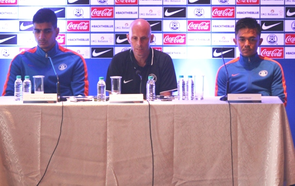 প্রি-ম্যাচ সাংবাদিক সম্মেলনে প্রাক্তন অধিনায়ক সুনীল ছেত্রী ও বর্তমান অধিনায়ক গুরপ্রীত সিংহর সঙ্গে কোচ কনস্টানটাইন।
