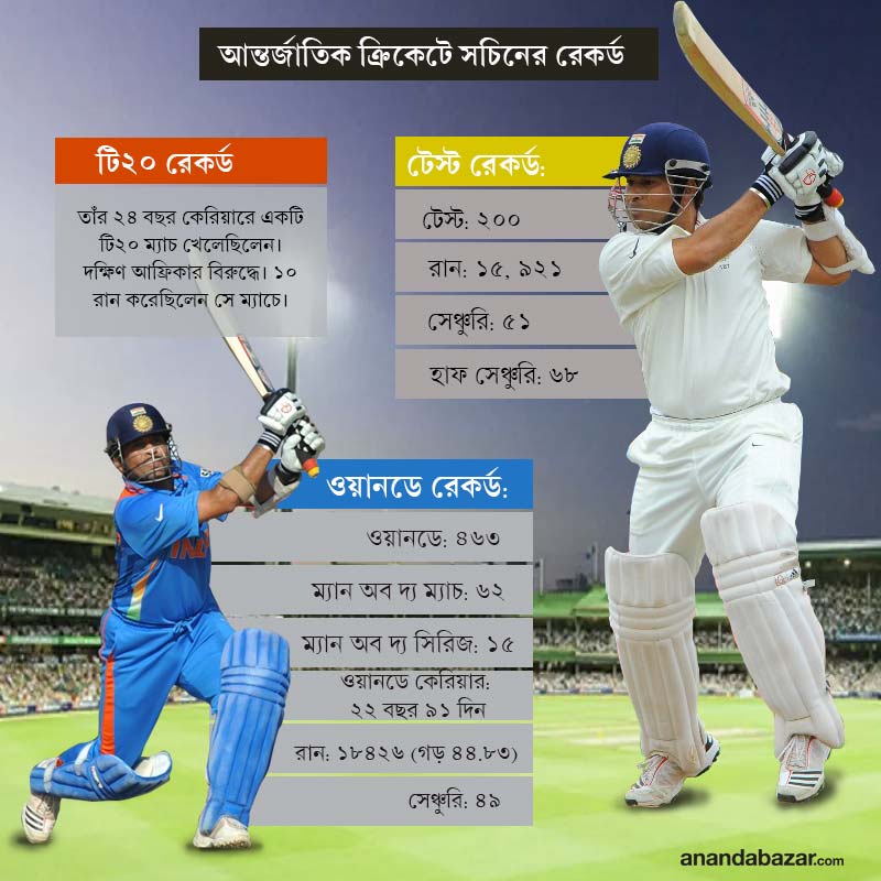 দেশের হয়ে ব্যাট হাতে পাকিস্তানের বিরুদ্ধে তাঁর ক্রিকেট সফর শুরু। সেই থেকে একের পর এক রেকর্ড যেন সচিনকে ক্রিকেটীয় পর্বতের শিখরে পৌঁছে দেয়। তিনিই বিশ্বের প্রথম ক্রিকেটার যিনি ১০০টি সেঞ্চুরি করেছেন। ওয়ান ডে-তে প্রথম ডাবল সেঞ্চুরি এবং টেস্ট ও এক দিনের আন্তর্জাতিক ক্রিকেটে ৩০ হাজার রান করেছেন সচিন। পেয়েছেন ভারতরত্ন, রাজীব গাঁধী খেল রত্ন, অর্জুন পুরস্কার এবং ভারত রত্ন। ২০১২-য় ওয়ানডে থেকে অবসর নেন। ২০১৩-য় অবসর নেন টেস্ট ক্রিকেট থেকে। ২২ গজ থেকে অবসর নিলেও ১৯৮৯ থেকে ২০১৩ পর্যন্ত যে ভাবে ক্রিকেট দুনিয়ায় দাপিয়ে বেড়িয়েছেন, যে ভাবে দর্শকদের আনন্দ দিয়েছেন তা কোনও দিন ভোলার নয়। খেলা ছা়ড়ার পর রাজনীতিতেও নাম লিখিয়েছেন। তিনি রাজ্যসভার এক জন সাংসদ। সচিন তাঁর কেরিয়ারের শুরুতে যেমন মানুষের মনে জায়গা করে নিয়েছেন, অবসরের পরেও সেই ভালবাসা আর সম্মানে এতটুকুও ছেদ পড়েনি।