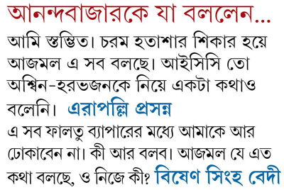 বেদী তো এই বিতর্কে ঢুকে সময় নষ্ট করতেই চাইছেন না। বলছেন, ‘‘এ সব ফালতু জিনিসের মধ্যে আমাকে আর ঢোকাবেন না। কী আর বলব। আজমল যে এত কথা বলছে, ও নিজে কী?’’