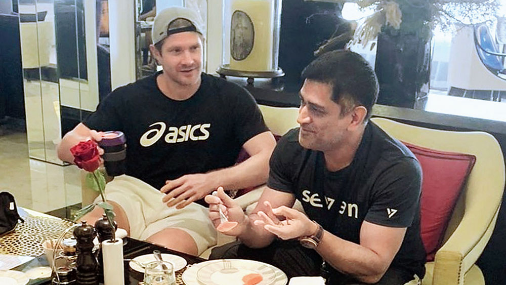 নজরে: নিভৃতবাস পর্ব শেষ। প্রাতরাশ টেবিলে ওয়াটসন ও ধোনি। শুক্রবারই প্রস্তুতিতে নেমে পড়ল সিএসকে। ছবি: টুইটার।