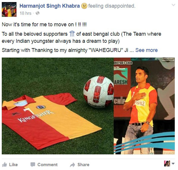 সাত বছর পর ইস্টবেঙ্গল ছাড়ার কথা ঘোষণা করে দিলেন দলের প্রাক্তন অধিনায়ক হরমনজ্যোত সিংহ খাবরা। ফেডারেশন কাপে ঘরের মাঠে লাজং এফসির সঙ্গে ড্র করে ফেডারেশন কাপ থেকে ছিটকে যাওয়ার পরই সোশ্যাল মিডিয়ায় তাঁর ইস্টবেঙ্গলকে বিদায় জানানোর কথা ঘোষণা করে দিলেন পঞ্জাবের এই ইউটিলিটি প্লেয়ার।