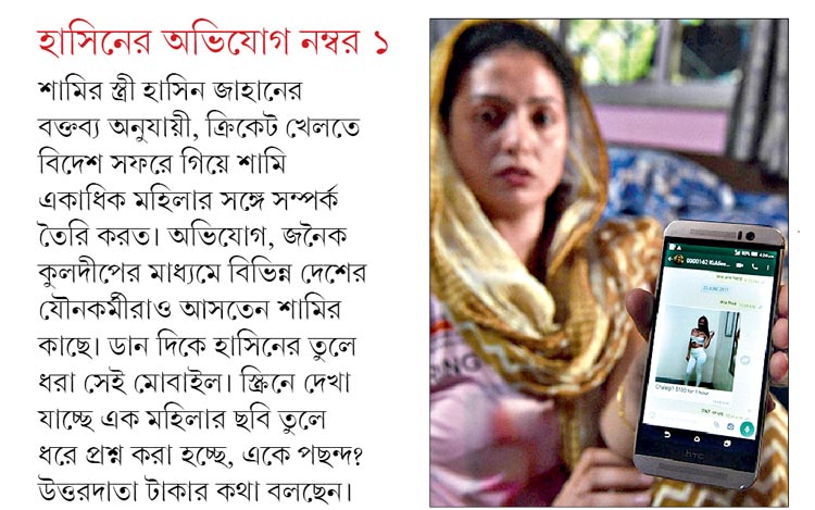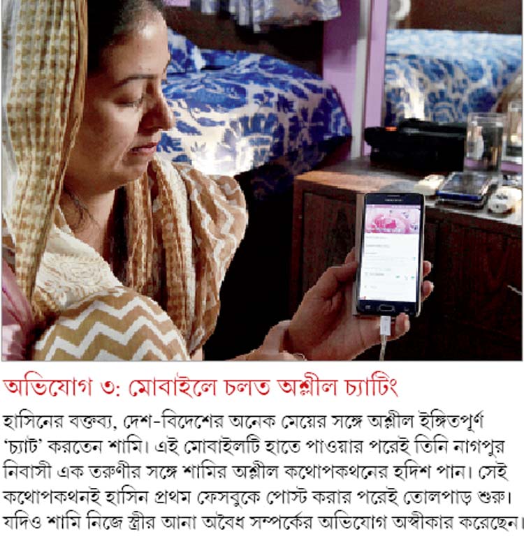 এ ছাড়াও হাসিনের অভিযোগ, বিভিন্ন নারীর সঙ্গে অশ্লীল ‘চ্যাট’ পাওয়া গিয়েছে মোবাইলে। সেই সব কথোপকথন একটি বিশেষ নাম দিয়ে আলাদা করে রেখে দিয়েছেন হাসিন। ক্রিকেট দুনিয়া যাঁকে চেনে সুইংয়ের সুলতান হিসেবে, তিনি এখন স্ত্রীর মোবাইলে আটক হয়ে আছেন ‘শামি গন্দা (নোংরা) চ্যাট’ নামে!