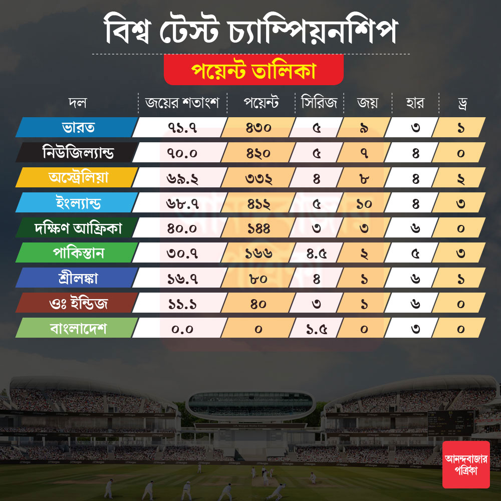 এই মুহূর্তে বিশ্ব টেস্ট চ্যাম্পিয়নশিপে প্রথম চারটি দল ভারত, নিউজিল্যান্ড, অস্ট্রেলিয়া এবং ইংল্যান্ড। এই চারটি দলের মধ্যে জয়ের শতকরা হারের (এটাকেই বিচার্য ধরা হচ্ছে) ব্যবধান মাত্র ৩।