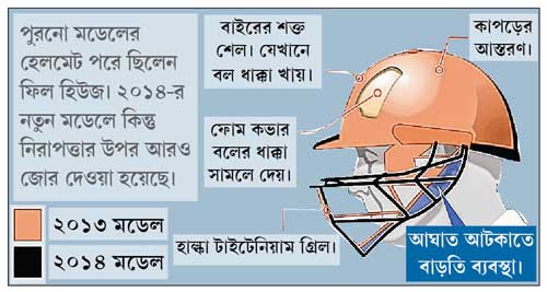 পুরনো মডেলের হালকা হেলমেট পরে ব্যাট করতে নামাই কি কাল হল ফিলিপ হিউজের? তেমনই বলছেন তাঁর সেই হেলমেটের নির্মাতা সংস্থার কর্তারা। দুর্ঘটনার সময় মাসুরি টেস্ট মডেল হেলমেট মাথায় ছিল হিউজের। যা ২০১৩-র মডেল। যা মাথার পিছনের অংশকে সে ভাবে রক্ষা করে না। কিন্তু মাসুরি সম্প্রতি যে আধুনিক মডেলের হেলমেট এনেছে, তাতে মাথার পিছনের দিকটা অনেকটাই সুরক্ষিত থাকে। ভিশন সিরিজ নামের এই নতুন মডেলের হেলমেট মাথায় থাকলে হিউজ এই দুর্ঘটনার কবলে পড়তেন কি না, তা নিয়ে মন্তব্য করতে না চাইলেও উইনচেস্টারের এই সংস্থার মুখপাত্র বলছেন, তাঁরা এই দুর্ঘটনার টিভি ফুটেজ ভাল করে পরীক্ষা করে হেলমেটের নতুন মডেল শোধরানোর উদ্যোগ নিতে পারেন। মূলত ইংল্যান্ড ক্রিকেট বোর্ডের সঙ্গে বাণিজ্যিক চুক্তিতে কাজ করা এই হেলমেট প্রস্তুতকারক সংস্থার মুখপাত্র এ দিন বলেন, “এমনিতেই আমরা অনেক পরীক্ষা ও গবেষণার পর নতুন সিরিজের এই হেলমেট তৈরি করেছি। এর পরও আমরা হিউজের ঘটনাটা ফের খঁুটিয়ে দেখব। যাতে ব্যাটসম্যানদের আরও সুরক্ষিত করার ব্যবস্থা করা যায়। তবে ফুটেজে দেখা গিয়েছে সে দিন হিউজ আমাদের পুরনো মডেলের হালকা হেলমেট মাথায় লাগিয়ে ব্যাট করছিল।”