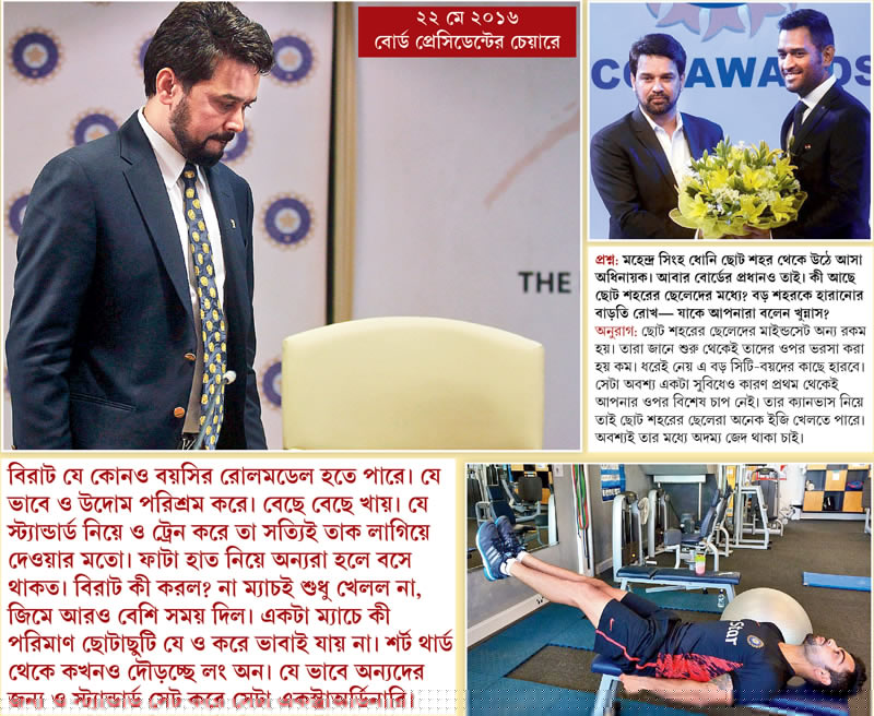 অনুরাগ: আমি আজ থেকে নয়, আমার পঁচিশ বছর বয়সে যখন বোর্ডে ঢুকেছি সেই সময় থেকেই প্লেয়ার অনুরাগী। এরা তো অনেকে আমার সঙ্গে খেলেছে। আর কীসের পদ নিয়ে মদমত্ততা? আমি রাজনীতিতে আছি বলে ভাগ্যক্রমে আরও ভাল জানি যে আজ আপনি পাওয়ারে তো কাল অপজিশনে। সব সময় আপনাকে মাটির কাছাকাছি থাকতে হবে কোনও রকম বসগিরি না করে। এই জন্যই তো সৌরভ-সচিন আর ভিভিএস-কে কমিটিতে আনতে পেরেছিলাম। দ্রাবিড়কে অবধি কোচ হতে রাজি করাতে পেরেছিলাম। জাস্ট ব্যক্তিগত সম্পর্কের খাতিরে।