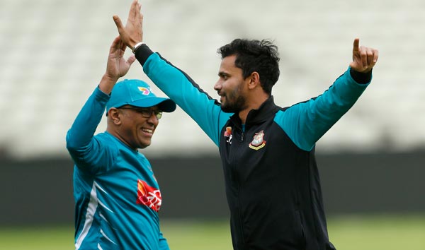 বাংলাদেশের অনুশীলনে কোচও অধিনায়ক। ছবি: রয়টার্স।