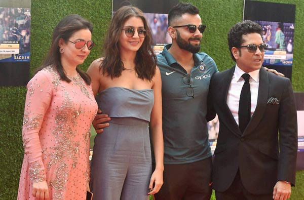 সচিন-অঞ্জলির সঙ্গে বিরাট-অনুষ্কা। ছবি: পিটিআই।