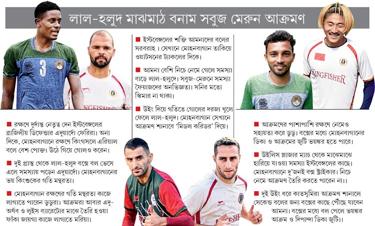 রবিবারের ম্যাচে কে জিতবে তা নিয়ে আগাম মন্তব্য করতে চাই না ঠিকই। তবে সাম্প্রতিক পারফরম্যান্স এবং ডুডু ওমাগবেমি যোগ দেওয়ায় একটু এগিয়ে রাখব ইস্টবেঙ্গলকে। তবে জিততে হলে কিন্তু রবিবার ইস্টবেঙ্গল কোচ খালিদ জামিলকে একটু সাহসী হতে হবে। ওর প্রিয় ৪-১-৪-১ স্ট্র্যাটেজি পরিবর্তন করতে হবে। ডুডু-র মতো স্ট্রাইকার ওর দলে। খালিদের উচিত ৪-৪-২ ফর্মেশনে দল সাজানো। সামনে থাকবে ডুডু ও উইলিস প্লাজা। কারণ, মোহনবাগানের চার ডিফেন্ডার অরিজিৎ বাগুই, কিংগসলে ওবুমনেমে, কিংশুক দেবনাথ ও রিকি-র মধ্যে বোঝাপড়া খুব ভাল। ক্যামেরন ওয়াটসনকে ডিফেন্সিভ ব্লকার হিসেবেই খেলাবে মোহনবাগান কোচ শঙ্করলাল চক্রবর্তী। ফলে এক স্ট্রাইকারে খেললে কিন্তু গোল পাওয়া কঠিন হবে ইস্টবেঙ্গলের। আই লিগে চ্যাম্পিয়ন হওয়ার স্বপ্ন বাঁচিয়ে রাখতে হলে এই ম্যাচটা জেতা অত্যন্ত গুরুত্বপূর্ণ ইস্টবেঙ্গলের জন্য।