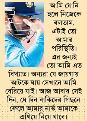 মহেন্দ্র সিংহ ধোনি: আমি ধোনি হলে নিজেকে বলতাম, এটাই তো আমার পরিস্থিতি। এর জন্যই তো আমি এত বিখ্যাত। অন্যরা যে জায়গায় আটকে যায় সেখানে আমি বেরিয়ে যাই। আজ আবার সেই দিন, যে দিন বাকিদের পিছনে ফেলে আমার নার্ভ আমাকে এগিয়ে নিয়ে যাবে।