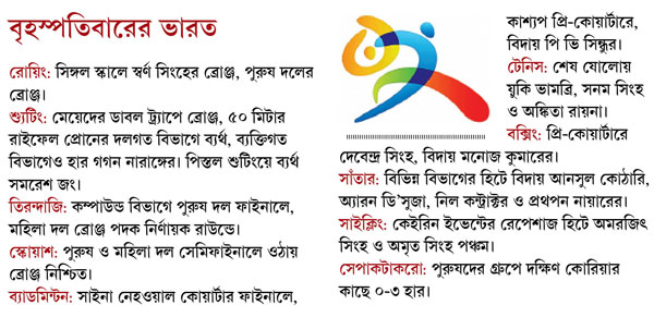 আজও দিনভর ডজনখানেক বিভিন্ন খেলায় নেমে ভারতীয়দের সংগ্রহ মাত্র তিনটি ব্রোঞ্জ। একটি শু্যটিং রেঞ্জ থেকে আনতে পেরেছে ডাবল ট্র্যাপে মহিলা দল। বাকি দু’টো দাঁড়িদের কল্যাণে। রোয়িংয়ের সিঙ্গল স্কালে ভারতের পুরুষ দল এবং ব্যক্তিগত বিভাগে স্বর্ণ সিংহ, উভয়ই তৃতীয়। ফলে প্রশ্ন উঠে গিয়েছে, ভারতীয় ক্রীড়াবিদদের দক্ষিণ কোরিয়ায় আরও আগে পাঠালে কি ভাল হত? পরিবেশের সঙ্গে আরও মানিয়ে নিতে পারলে কি ফল এর চেয়ে ভাল হত? এমনকী সাইনা নেহওয়ালের কোয়ার্টার ফাইনালে ওঠা, তিরন্দাজি ও স্কোয়াশে আরও চারটি পদক জেতা নিশ্চিত হওয়াএ দিনের এ সব ভাল খবরও পিছনে পড়ে গিয়েছে।