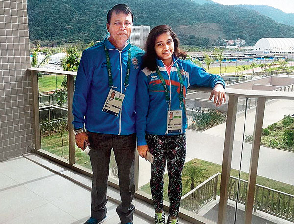 রিও পৌঁছে গেলেন দীপা কর্মকার। রবিবার কোচের সঙ্গে ভারতীয় জিমন্যাস্ট। ছবি: পিটিআই