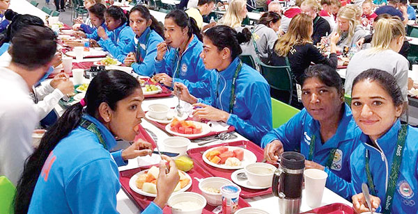 ছত্রিশ বছর পর আবার ভারতের মহিলা হকি দল অলিম্পিক্সে। রবিবার রিওর গেমস ভিলেজের ব্রেকফাস্ট টেবলে। ছবি: টুইটার