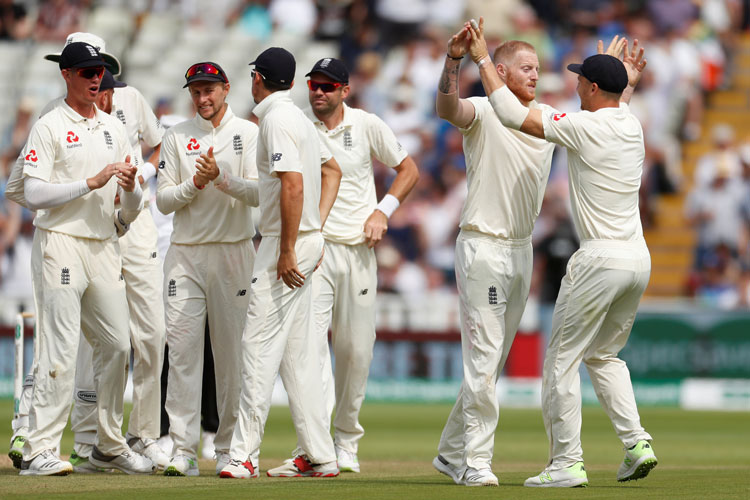 এদিন তিন উইকেট নিলেন বেন স্টোকস। তাঁকে অভিনন্দন সতীর্থদের। ছবি: রয়টার্স।