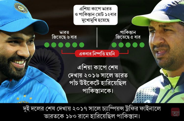 এশিয়া কাপে ভারত ও পাকিস্তান মোট ১২ বার মুখোমুখি হয়েছে। ভারত জিতেছে ছ’বার। হেরেছে পাঁচ বার। একবার নিষ্পত্তি হয়নি। এশিয়া কাপে শেষ দেখাতেও জিতেছে ভারত। ২০১৬ সালে ভারত পাঁচ উইকেটে হারিয়েছিল পাকিস্তানকে।