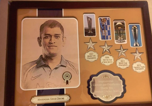 বর্তমান অধিনায়কের হাত দিয়েই প্রাক্তন অধিনায়কের হাতে তুলে দেওয়া হল মেমেন্টো। সেটা স্বয়ং এগিয়ে দিলেন কোচ কুম্বলে। আবারও হাততালি, আবারও ধোনিকে ঘিরে আবেগে ভাসল মেন ইন ব্লু। অধিনায়ক হিসেবে ভারতীয় ক্রিকেটকে সেরা সাফল্য দিয়েছেন মহেন্দ্র সিংহ ধোনিই। ২০০৭ টি২০ বিশ্বকাপ, ২০১১ বিশ্বকাপ, ২০১৩ চ্যাম্পিয়ন্স ট্রফি রয়েছে অধিনায়ক ধোনির দখলে। সেই সাফল্য খোদাই করা মেমেন্টোই তুলে দেওয়া হল ধোনির হাতে। সঙ্গে খোদিত তাঁর ছবি।