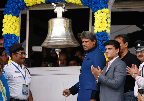 ইডেন বেল বাজিয়ে টেস্টের সূচনা। ছবি: এপি।