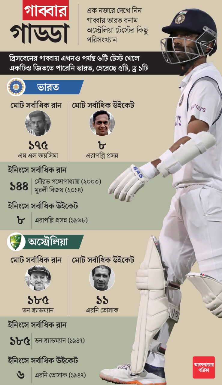 এখনও অবধি গাব্বায় একটি টেস্টেও জিততে পারেনি ভারত। শুক্রবার থেকে শুরু হতে চলা টেস্টে রাহানেরা জিততে পারলে তৈরি হবে প্রথম জয়ের ইতিহাস। সঙ্গে রয়েছে অস্ট্রেলিয়ার মাঠে দ্বিতীয়বার সিরিজ জয়ের হাতছানি। চোট-আঘাতে জর্জরিত ভারতীয় দল সেই অঘটন ঘটাতে পারে কি না সেই দিকেই তাকিয়ে থাকবেন সমর্থকরা।