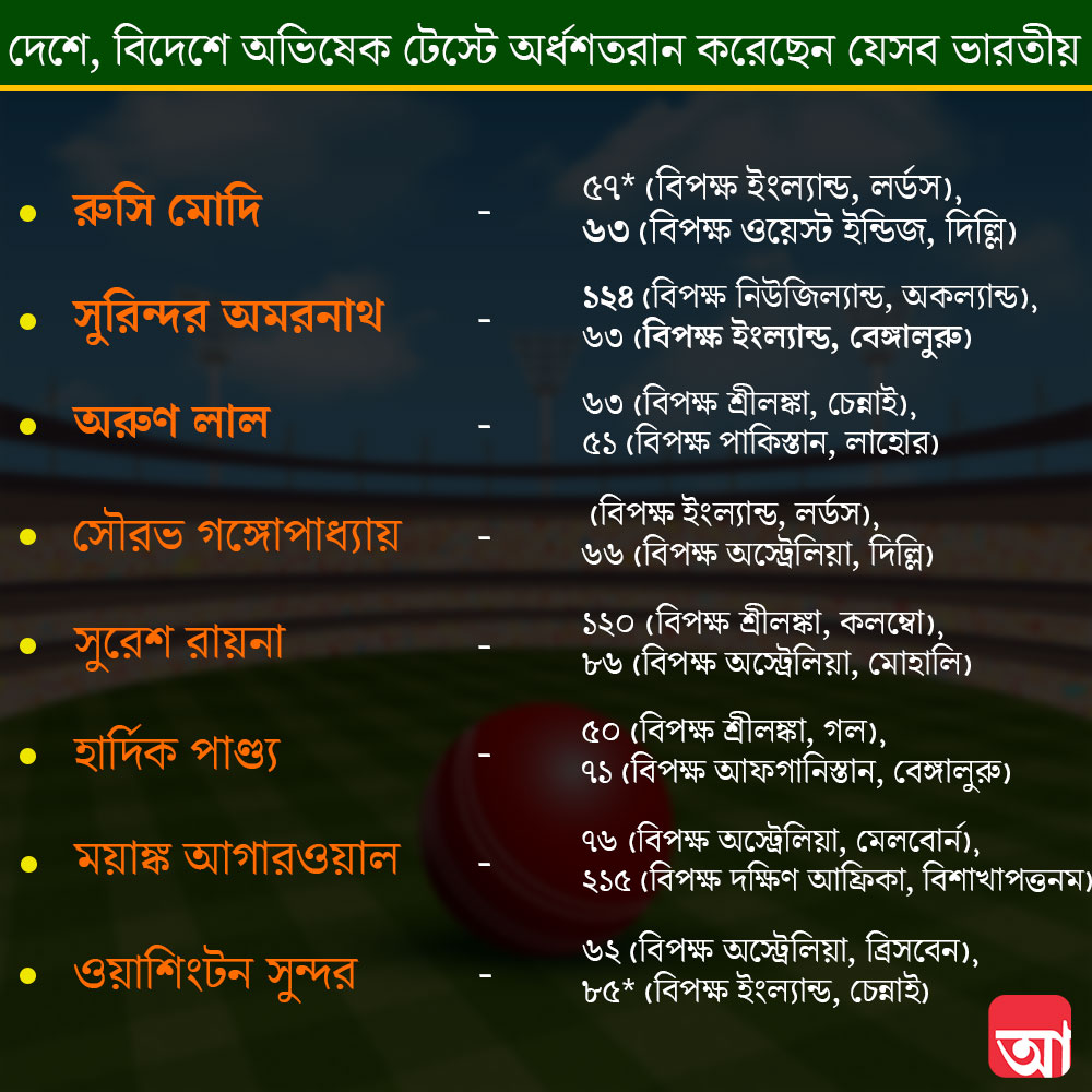 ভারতীয়দের মধ্যে এই কৃতিত্ব আছে আরও ৭ জনের। প্রথম এই নজির গড়েছিলেন রুসি মোদি। এরপর সুরিন্দর অমরনাথ, অরুণ লাল, সৌরভ, সুরেশ রায়না, হার্দিক পাণ্ড্য, ময়াঙ্ক আগারওয়াল এই কৃতিত্ব অর্জন করেছেন।