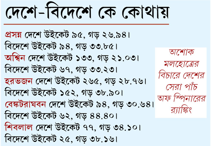 আমার কাছে সেরা পাঁচ ভারতীয় অফ স্পিনারের র‌্যাঙ্কিং এ রকম: প্রসন্ন এক নম্বরে। তার পর থাকবে অশ্বিন। তিন থেকে পাঁচে রাখব হরভজন সিংহ, বেঙ্কটরাঘবন ও শিবলাল যাদবকে।