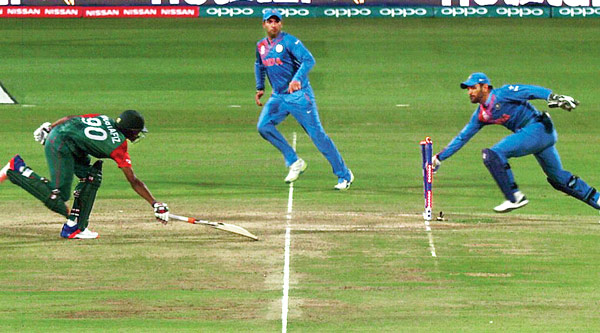 হার্দিকের তৃতীয় বলে চালাতে গিয়ে উঁচু ক্যাচ তুললেন মুশফিক। শিখর ধবন ধরতে ভুল করলেন না। পরেরটা এ বার মাহমুদউল্লাহ, সেই আকাশে বল, নীচে জাডেজার নির্ভুল হাত। শেষ বলে দুই চাই, সামনে মুস্তাফিজুর। হার্দিকের বল ব্যাটে বলে হল না, মুস্তাফিজ দৌড় দিলেন সুপার ওভারের লক্ষ্যে। উইকেটের পিছন থেকে আরও একজন ছুটে আসছেন, তিনি মহেন্দ্র সিংহ ধোনি, আসছেন উইকেটটা ভাঙতে।