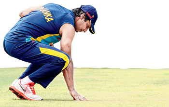 জীবনের শেষ পারফরম্যান্স-মঞ্চ মেপে নিচ্ছেন সঙ্গকারা। ছবি: এএফপি