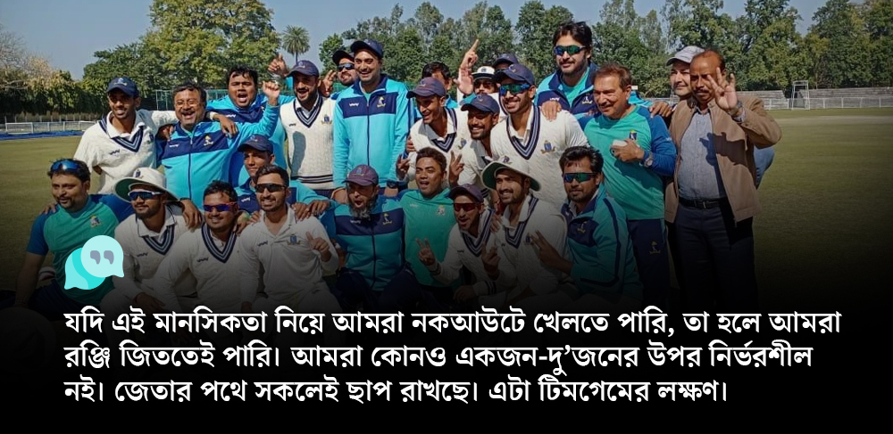 গ্রিনটপে যেমন জয় এসেছে, তেমনই ঘূর্ণি পিচেও জিতেছে বাংলা। তার মানে দুটো চরম বিপরীত কন্ডিশনে এসেছে সাফল্য। এটা তো শক্তিশালী রিজার্ভ বেঞ্চেরই ইঙ্গিত দিচ্ছে।