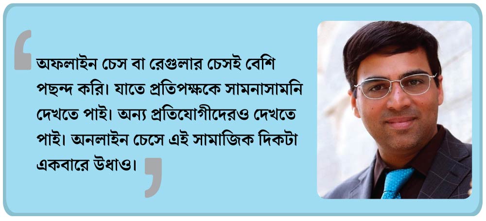 আনন্দ: সত্যি বলতে, আমি অফলাইন চেস বা রেগুলার চেসই বেশি পছন্দ করি। যাতে প্রতিপক্ষকে সামনাসামনি দেখতে পাই। অন্য প্রতিযোগীদেরও দেখতে পাই। অনলাইন চেসে এই সামাজিক দিকটা একবারে উধাও। এটাই সবচেয়ে বেশি মিস করি। অনলাইন চেসের ক্ষেত্রে ইন্টারনেট সংযোগও একটা সমস্যা। কখনও কখনও ব্যাপারটা যন্ত্রণাদায়ক হয়ে ওঠে। তবে আশা করা যায়, সময়ের সঙ্গে সঙ্গে উন্নত হবে পরিকাঠামো। অনলাইনে খেলার অভিজ্ঞতাও বাড়বে।