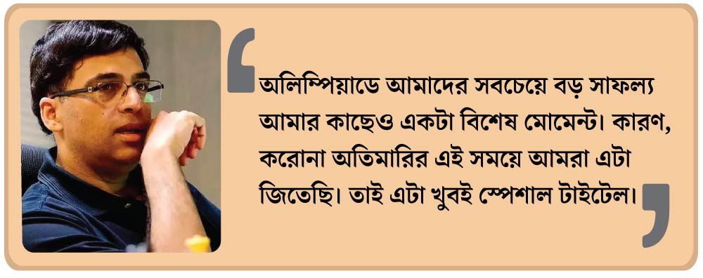 আনন্দ: নাটকীয় পরিস্থিতির সৃষ্টি হয়েছিল অলিম্পিয়াডে। আমরা সেমিফাইনালে খুব ক্লোজ ম্যাচ জিতেছিলাম পোল্যান্ডের বিরুদ্ধে। গ্রুপ পর্যায়ে আমাদের পারফরম্যান্সও দারুণ ছিল। ইন্টারনেট সমস্যা সত্ত্বেও আমরা জিতেছি। আমরা আগে কখনও অলিম্পিয়াডে সোনা জিতিনি। টিম ইভেন্টে সেরা হতে পেরে অন্য রকম একটা তৃপ্তি পাচ্ছি। ভারতীয় দাবার শক্তি আমরা মেলে ধরতে পেরেছি অলিম্পিয়াডে। দারুণ দল ছিল আমাদের।