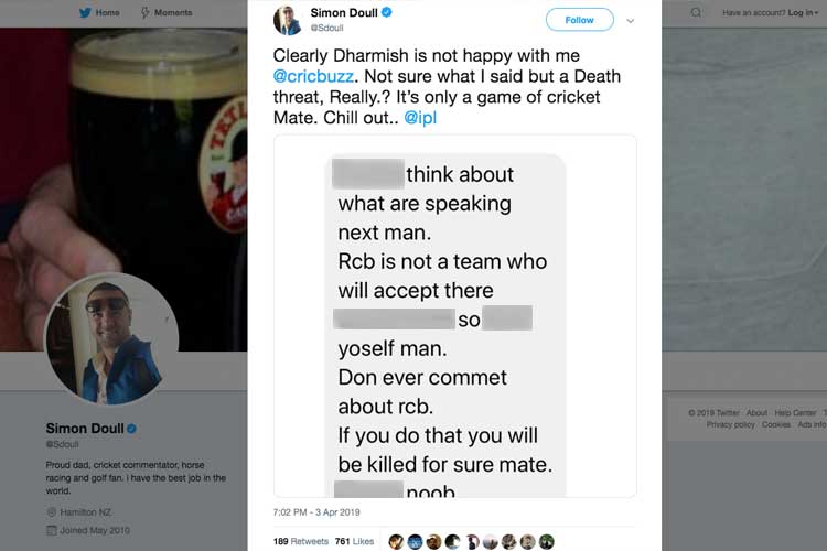 হতাশায় ভুগছেন সমর্থকরা। এর মধ্যেই এক আরসিবি ভক্ত সটান খুনের হুমকি দিয়ে বসলেন প্রাক্তন ক্রিকেটার এবং আইপিএলের ধারাভাষ্যকার সাইমন ডুলকে।