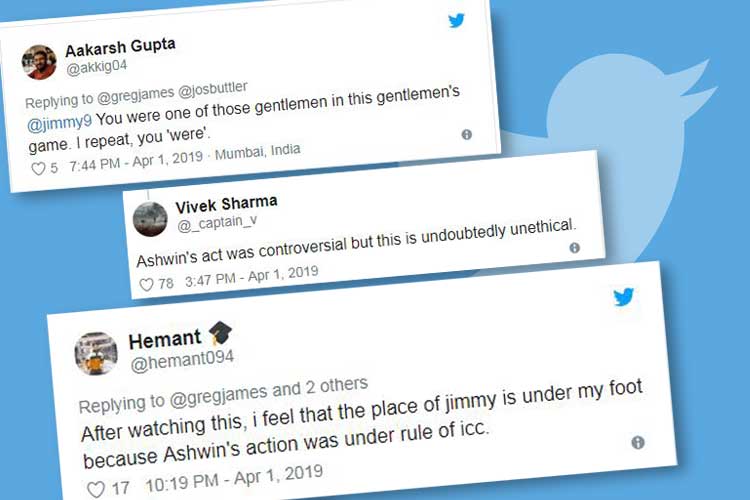 এর মাধ্যমেই অ্যান্ডারসন বুঝিয়ে দেন, তিনি রান আউট কাণ্ডে অশ্বিনকে মোটেও সমর্থন করছেন না। ইংল্যান্ডের ব্যাটসম্যান বাটলারের পক্ষেই দাঁড়াচ্ছেন অ্যান্ডারসন। ইংরেজ পেসারের মতপ্রকাশের ধরনধারণ পছন্দ হয়নি অনেকের। তাঁরাও সোশ্যাল মিডিয়ায় পাল্টা দিয়েছেন অ্যান্ডারসনকে।