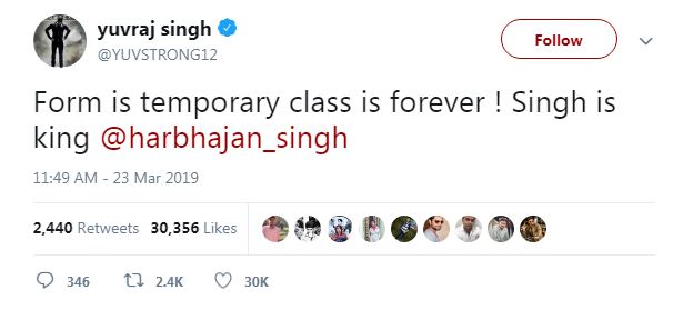তাঁর মায়াজাল দেখে স্থির থাকতে পারেননি মুম্বই ইন্ডিয়ান্সের যুবরাজ সিংহ। টুইট করে এক সময়ের জাতীয় দলের সতীর্থকে অভিনন্দন জানিয়েছেন যুবি। মনে করিয়ে দিয়েছেন সেই আপ্তবাক্য, ‘ফর্ম ইজ টেম্পোরারি, ক্লাস ইজ পার্মানেন্ট। সিং ইজ কিং।‘
