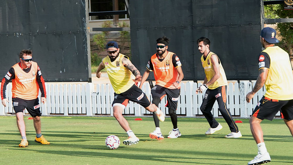 চনমনে: আইপিএল প্রস্তুতির মধ্যেই ফুটবল নিয়ে মেতে আরসিবি অধিনায়ক কোহালি, চহালরা। রবিবার। ছবি: টুইটার