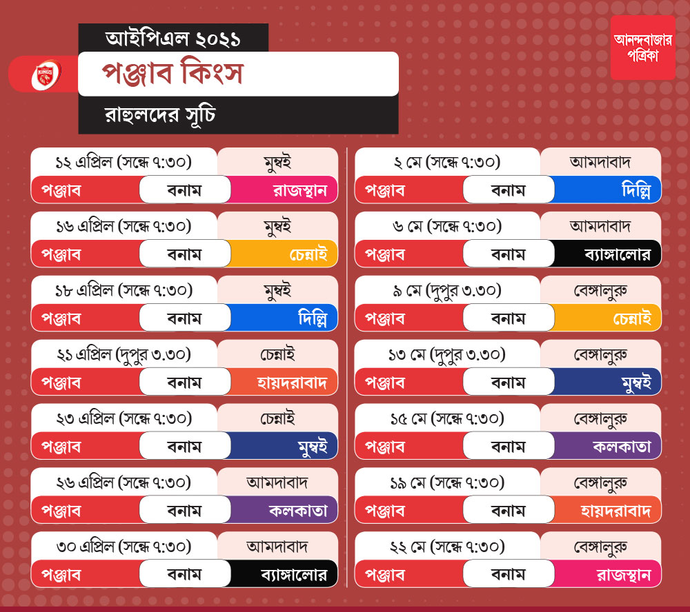 মুম্বই, চেন্নাই, আমদাবাদ এবং বেঙ্গালুরুর মাঠে লিগের ম্যাচ খেলবে পঞ্জাব। প্রথম ৩টি ম্যাচ মুম্বইয়ে। তারপর ২টো ম্যাচ চেন্নাইয়ে খেলবেন রাহুলরা। পরের ৪টে ম্যাচ আমদাবাদে এবং শেষ ৫টি ম্যাচ খেলবে বেঙ্গালুরুতে। কলকাতা নাইট রাইডার্সের বিরুদ্ধে রাহুলরা প্রথম ম্যাচ খেলবেন ২৬ এপ্রিল। ফিরতি ম্যাচ ১৫ মে বেঙ্গালুরুর মাঠে। এ বার প্লে অফে উঠতে পারবেন রাহুলরা?