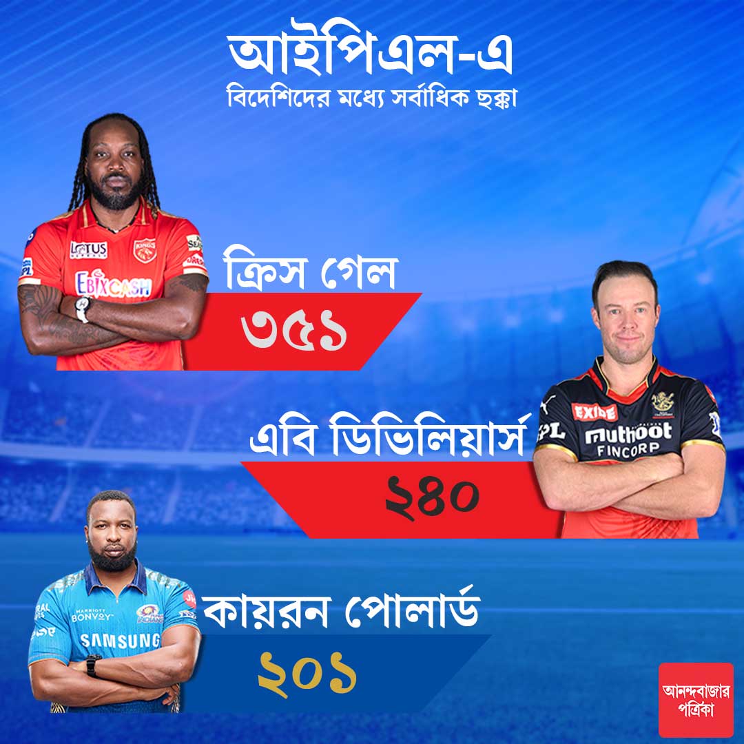 ওয়েস্ট ইন্ডিজের এই ব্যাটসম্যানের আইপিএল-এ মোট ছক্কার সংখ্যা এখনও পর্যন্ত ২০১। তিনি ডেভিড ওয়ার্নারের সঙ্গে যুগ্ম ভাবে তৃতীয় স্থানে ছিলেন। ওয়ার্নারেরই হায়দরাবাদের বিরুদ্ধে ৩টি ছক্কা মেরে তিনি ১৯৮ থেকে ২০১-এ পৌঁছে যান। এই তালিকায় শীর্ষে আছেন ক্রিস গেল। তিনি ৩৫১টি ছয় মেরেছেন। তাঁর ধারেকাছে কেউ নেই। দ্বিতীয় স্থানে এবি ডিভিলিয়ার্স। তিনি এখনও পর্যন্ত মোট ২৪০টি ছয় মেরেছেন। এরপর ২০১টি ছয় মেরে পোলার্ড তিনে।