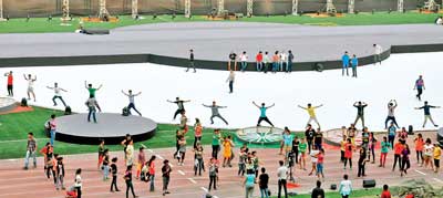দিন দুয়েকেই আইপিএল-এর সূচনা অনুষ্ঠান। তার প্রস্তুতিতে সামিল কচিকাঁচারাও। শনিবার, যুবভারতী ক্রীড়াঙ্গনে। ছবি: শৌভিক দে