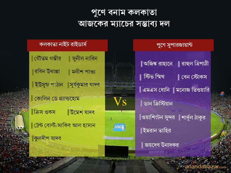 ২৯ বছরের এই সিমার অবশ্য দলের সঙ্গেই পুণে যাননি। কোল্টার নাইলের পরিবর্তে নাইটদের দলে আসতে পারেন ট্রেন্ট বোল্ট অথবা সাকিব আল হাসান। কলিন ডে গ্র্যান্ডহোম ব্যাট হাতে রবিবার এমন কিছু করতে না পারলেও দলে থাকার সম্ভাবনা রয়েছে। পুরো আইপিএল দারুণ ছন্দে সুনীল নারিন। ব্যাট হাতে গম্ভীরের সঙ্গে ব্যাট করেও সাফল্য পাচ্ছেন নিয়মিত। ফাস্ট বোলারদের ৫৩ বল খেলে ৯৩ রান করেছেন নারিন। পুণে তাঁর বিরুদ্ধে কী ভাবে ইমরান তাহির বা ওয়াশিংটন সুন্দরকে ব্যবহার করবে এখন সেটাই দেখার।